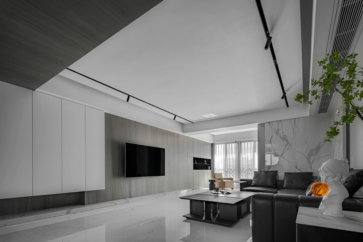 本案以灰白作為空間的主基調,依靠黑色和極少的跳躍色來完成空間的節奏感。我們想表達一個安靜且舒適的生活空間,在主材的挑選上我們有意的將色彩的飽和度降低,用大面積的體塊來表現預先設定的氛圍。