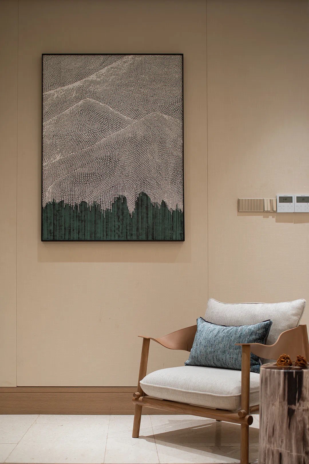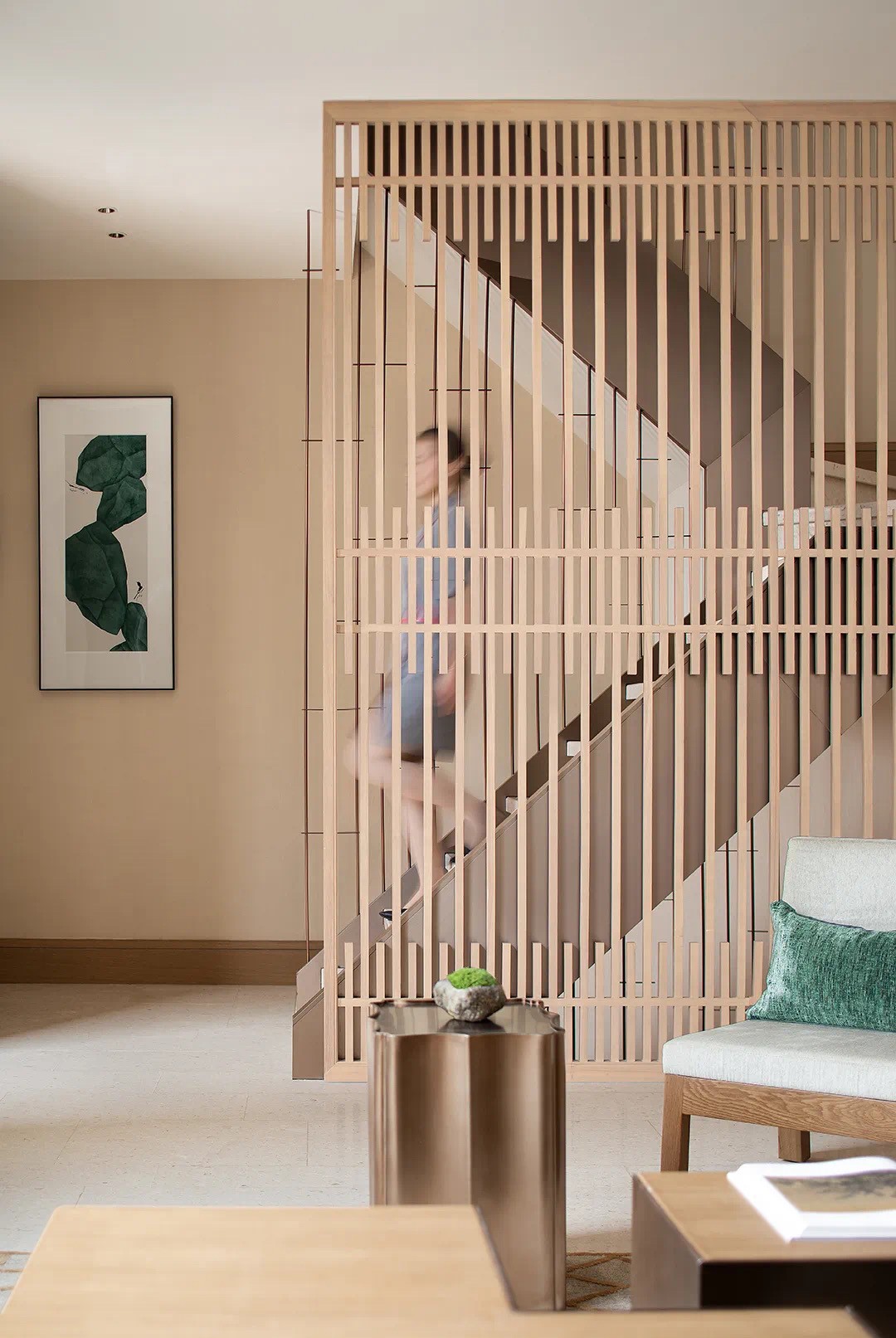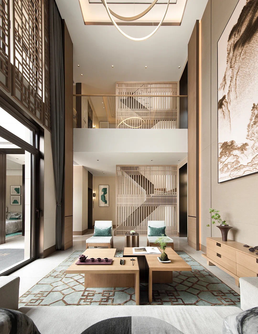 巧妙地與入戶大門(mén)形成對(duì)景關(guān)系,視覺(jué)由近引向深遠(yuǎn),整個(gè)空間的意境已然呈現(xiàn)。