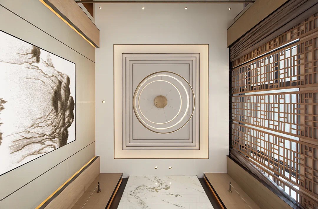 天花及吊燈的造型借園林框景之法,營(yíng)造大自然回旋的視覺(jué)美感,入戶門(mén)上半部分的槅窗在陽(yáng)光投射下,光影靈動(dòng)閃逸,細(xì)膩婉約。