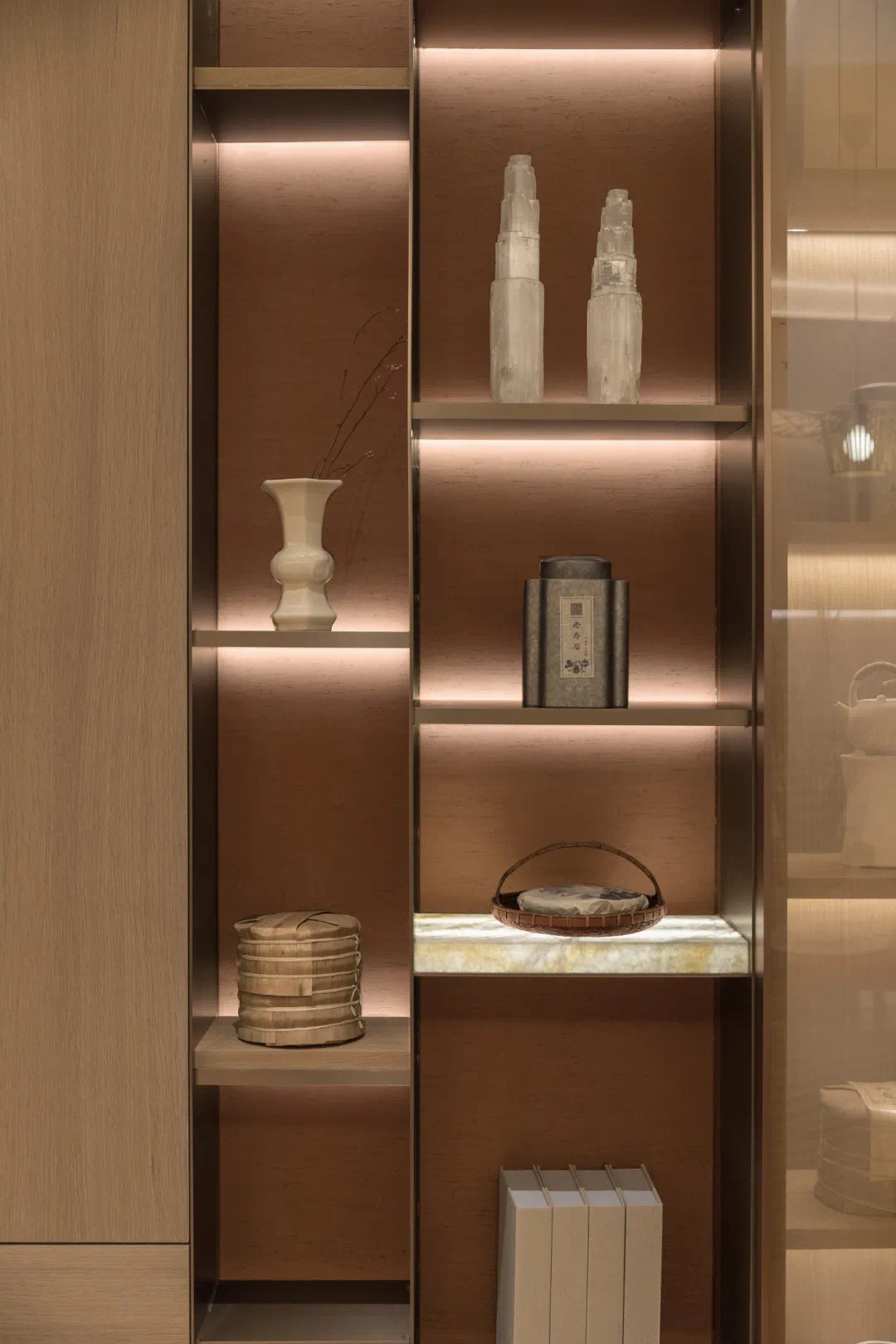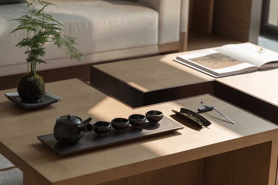 入戶見(jiàn)景,從戶外庭院步入室內(nèi),茗茶區(qū)承載著情緒轉(zhuǎn)換的首要功能,在城市繁華與舒適雅靜之間,找到平衡。