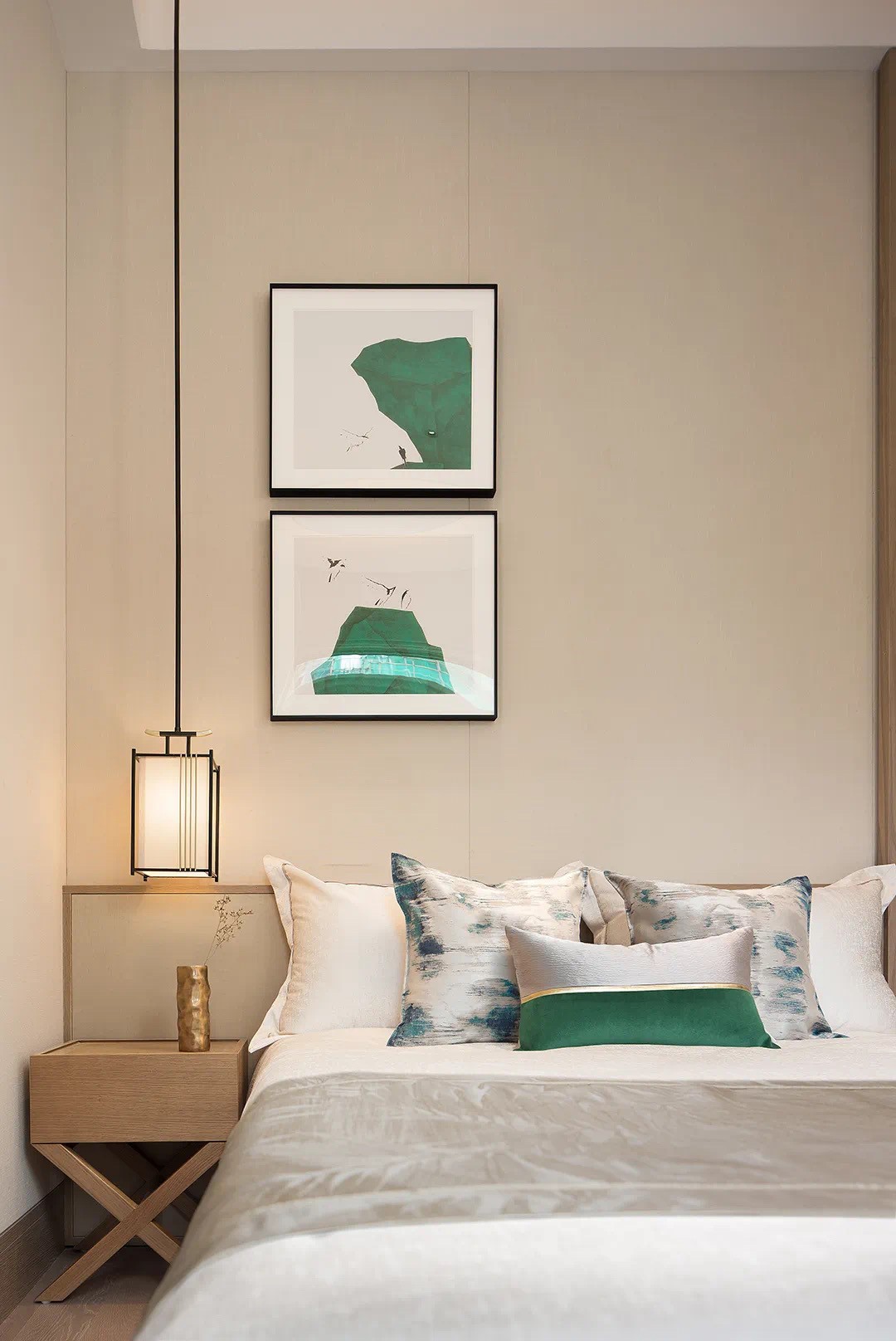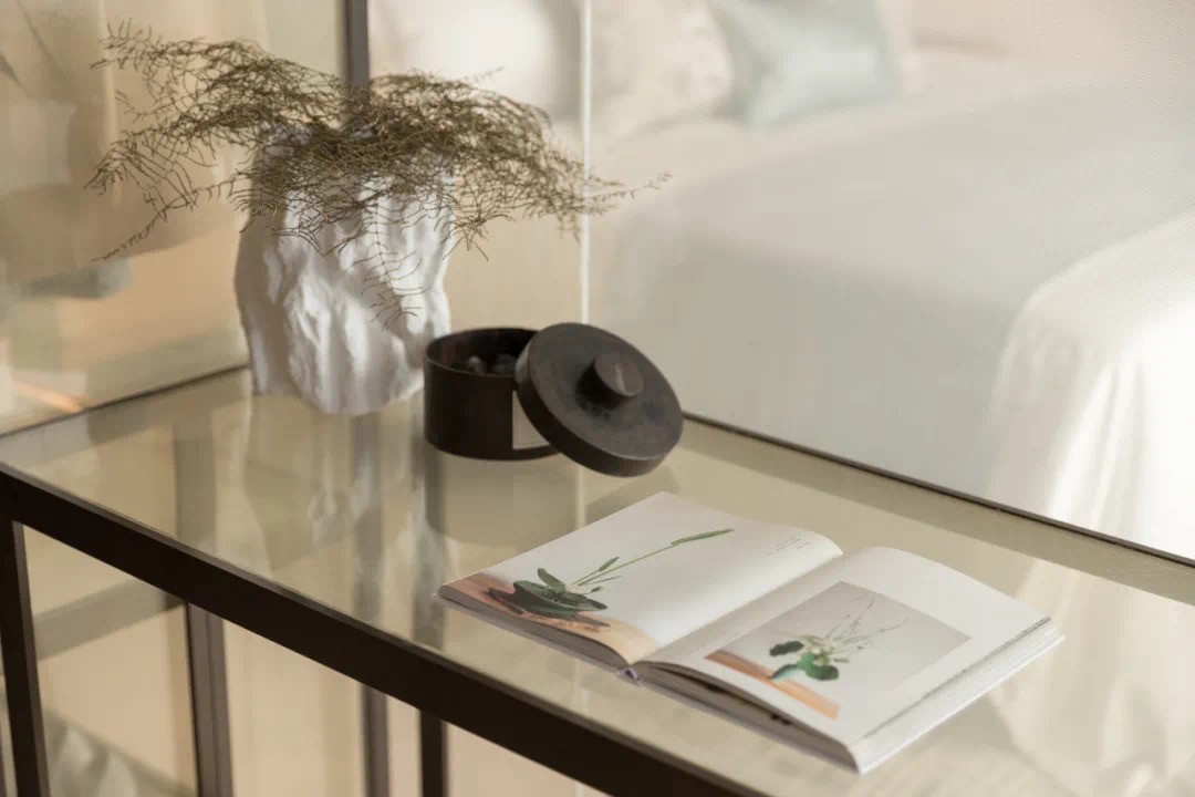 以“萬(wàn)綠河源”的“湖綠”為搭配色淵源,空間局部以雅綠點(diǎn)綴,地毯、布藝、盤(pán)墊、掛畫(huà)、物件……呈現(xiàn)細(xì)微的色彩表情,低調(diào)不失雅致,質(zhì)感兼具品味。