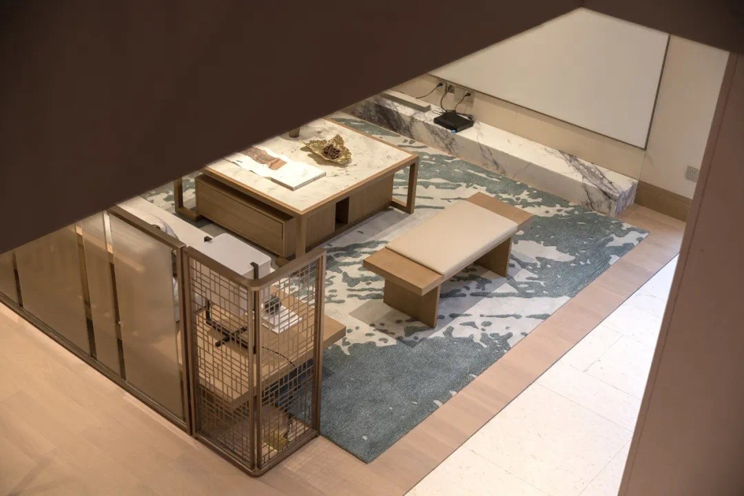 以物見(jiàn)性,材質(zhì)肌理表達(dá)不同的情緒,白金米黃大理石溫潤(rùn)面的至雅;橡木木飾面的至善;香梅雪大理石的至情;山水畫(huà)大理石的至境;白水晶大理石斧剁面的至樸。