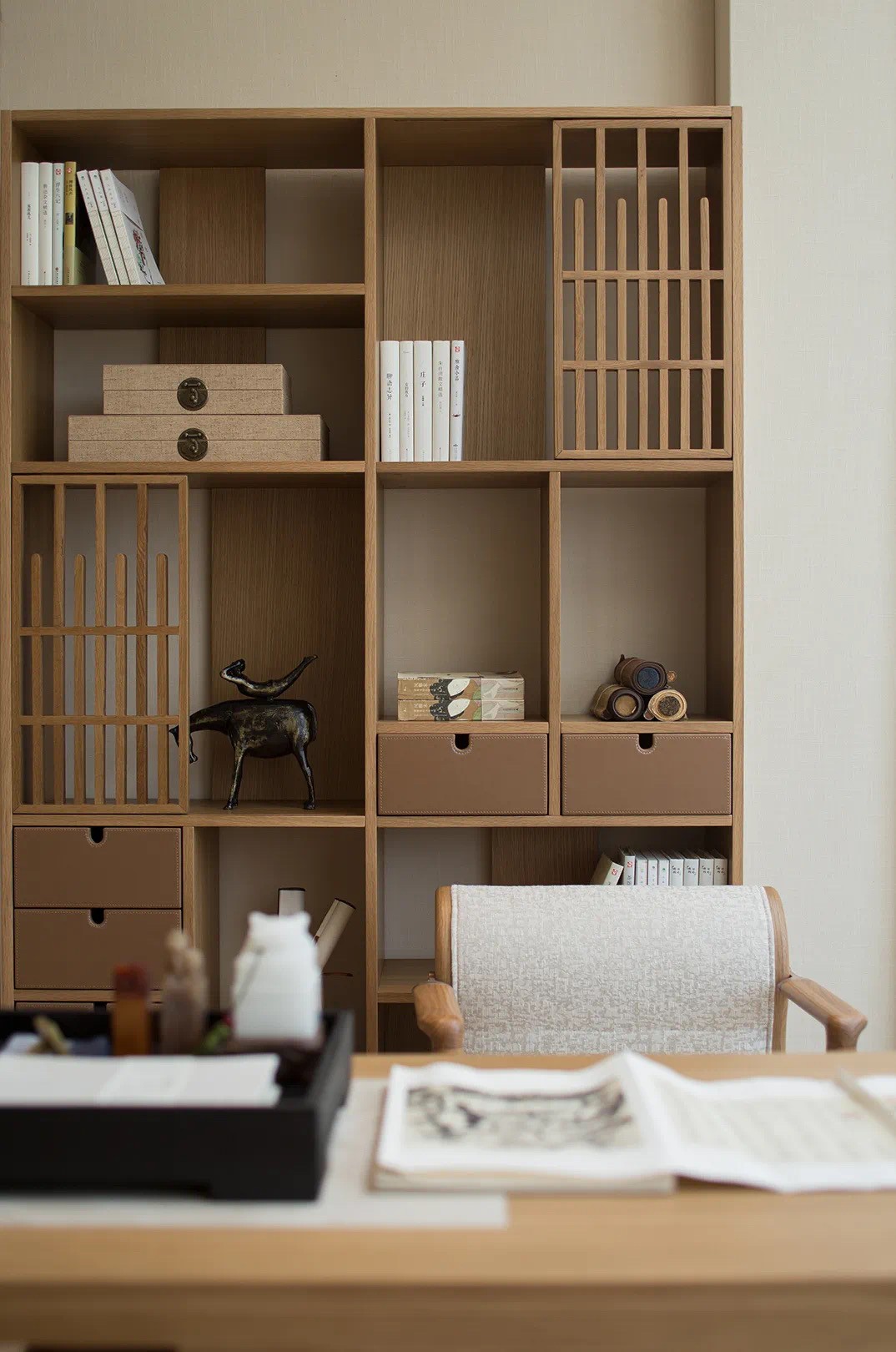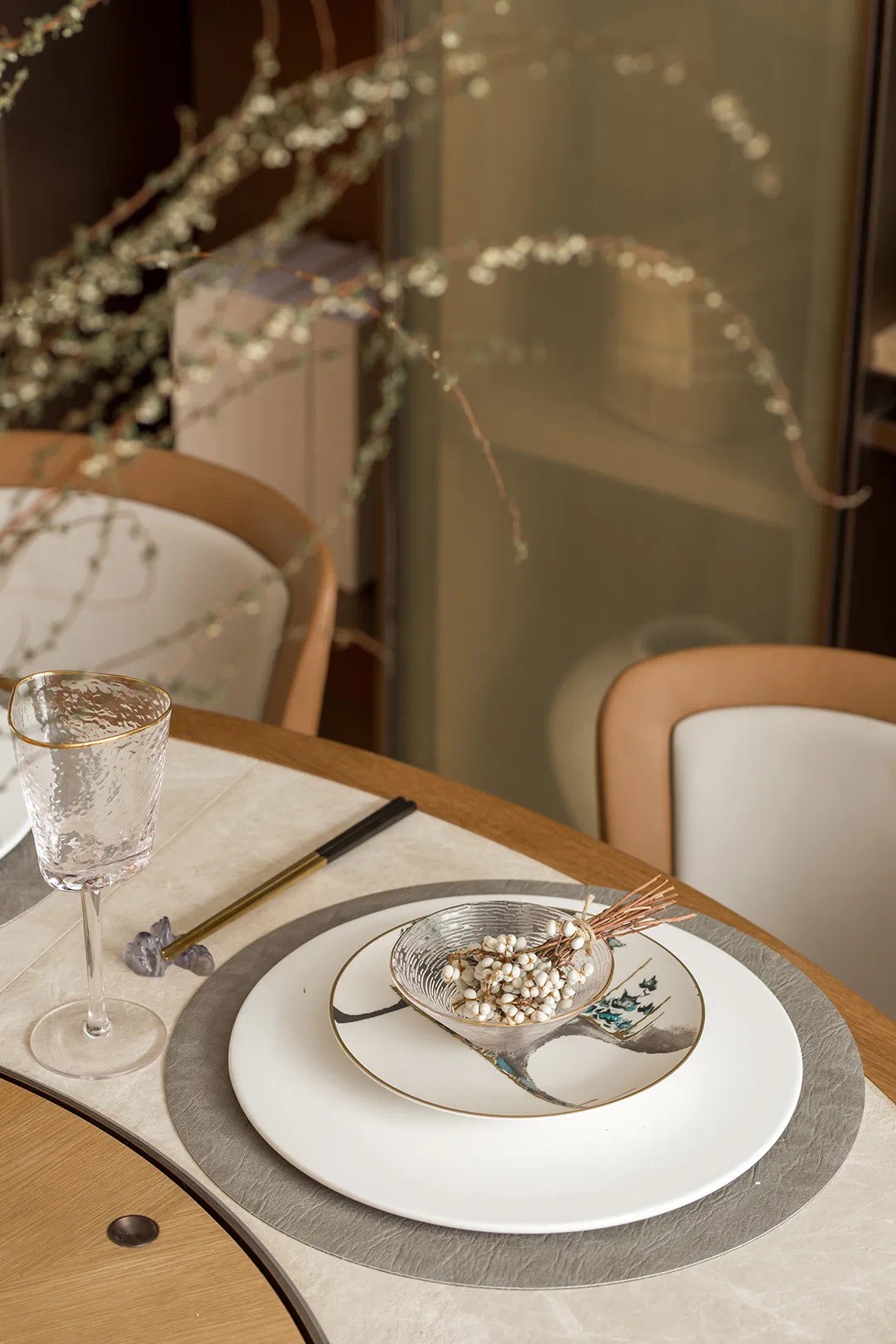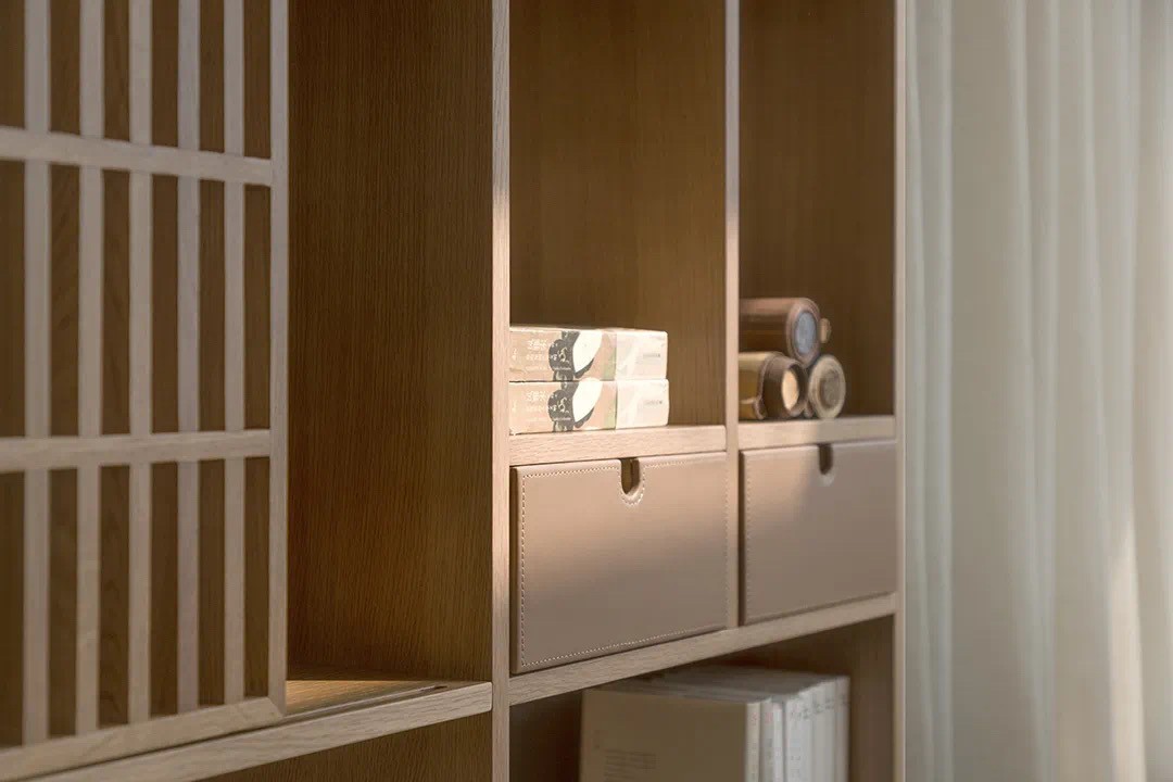 餐廳虛實(shí)柜體的錯(cuò)位設(shè)計(jì),進(jìn)退的重疊體塊,配合紫砂色,家具皮革局部點(diǎn)綴,化繁為簡(jiǎn),一剪枝,一蒿草,一書(shū)一盆栽,與室內(nèi)建造美學(xué)相互呼應(yīng)。